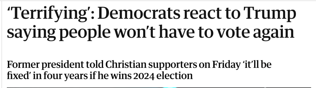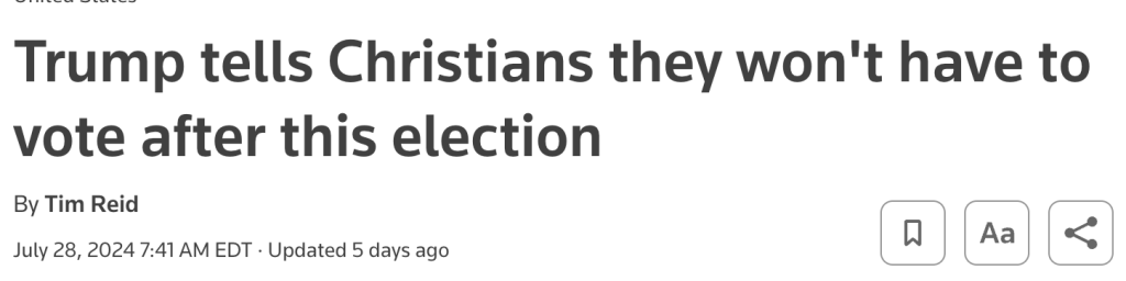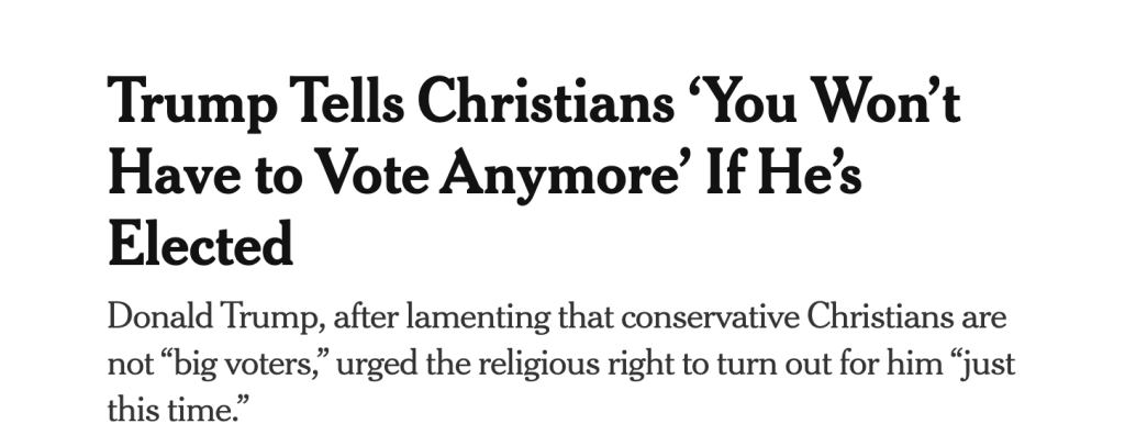 But until then, Republicans must win. We have to win this election—most important election ever. We want a landslide that’s too big to rig. If you want to save America, get your friends, get your family, get everyone you know, and vote. Vote early. Vote absentee. Vote on Election Day. I don’t care how, but you have to get out and vote. And again, Christians, get out and vote. Just this time. You won’t have to do it anymore. Four more years. You know what? It’ll be fixed, it’ll be fine. You won’t have to vote anymore, my beautiful Christians. I love you, Christians. I’m a Christian. I love you. Get out. You got to get out and vote. In four years, you don’t have to vote again. We have it fixed so good, you’re not going to have to vote.