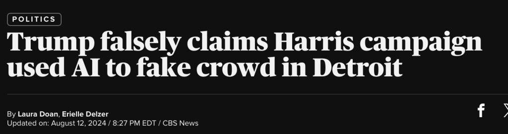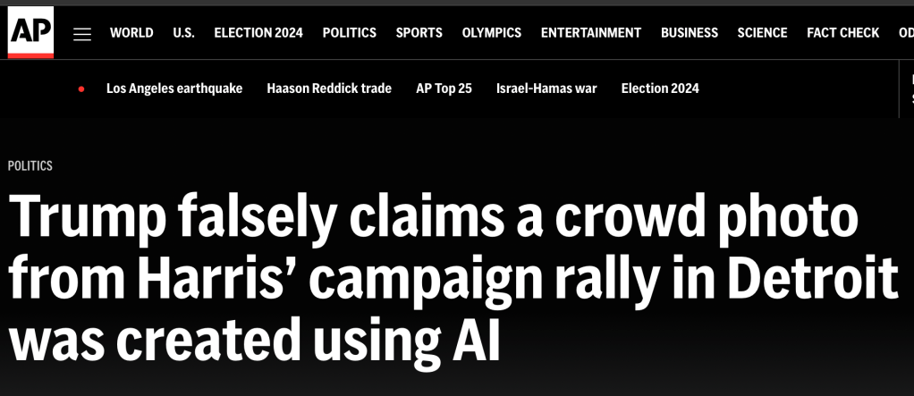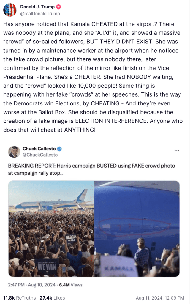 Has anyone noticed that Kamala CHEATED at the airport? There was nobody at the plane, and she “A.I.’d” it, and showed a massive “crowd” of so-called followers, BUT THEY DIDN’T EXIST! She was turned in by a maintenance worker at the airport when he noticed the fake crowd picture, but there was nobody there, later confirmed by the reflection of the mirror like finish on the Vice Presidential Plane. She’s a CHEATER. She had NOBODY waiting, and the “crowd” looked like 10,000 people! Same thing is happening with her fake “crowds” at her speeches. This is the way the Democrats win Elections, by CHEATING – And they’re even worse at the Ballot Box. She should be disqualified because the creation of a fake image is ELECTION INTERFERENCE. Anyone who does that will cheat at ANYTHING!